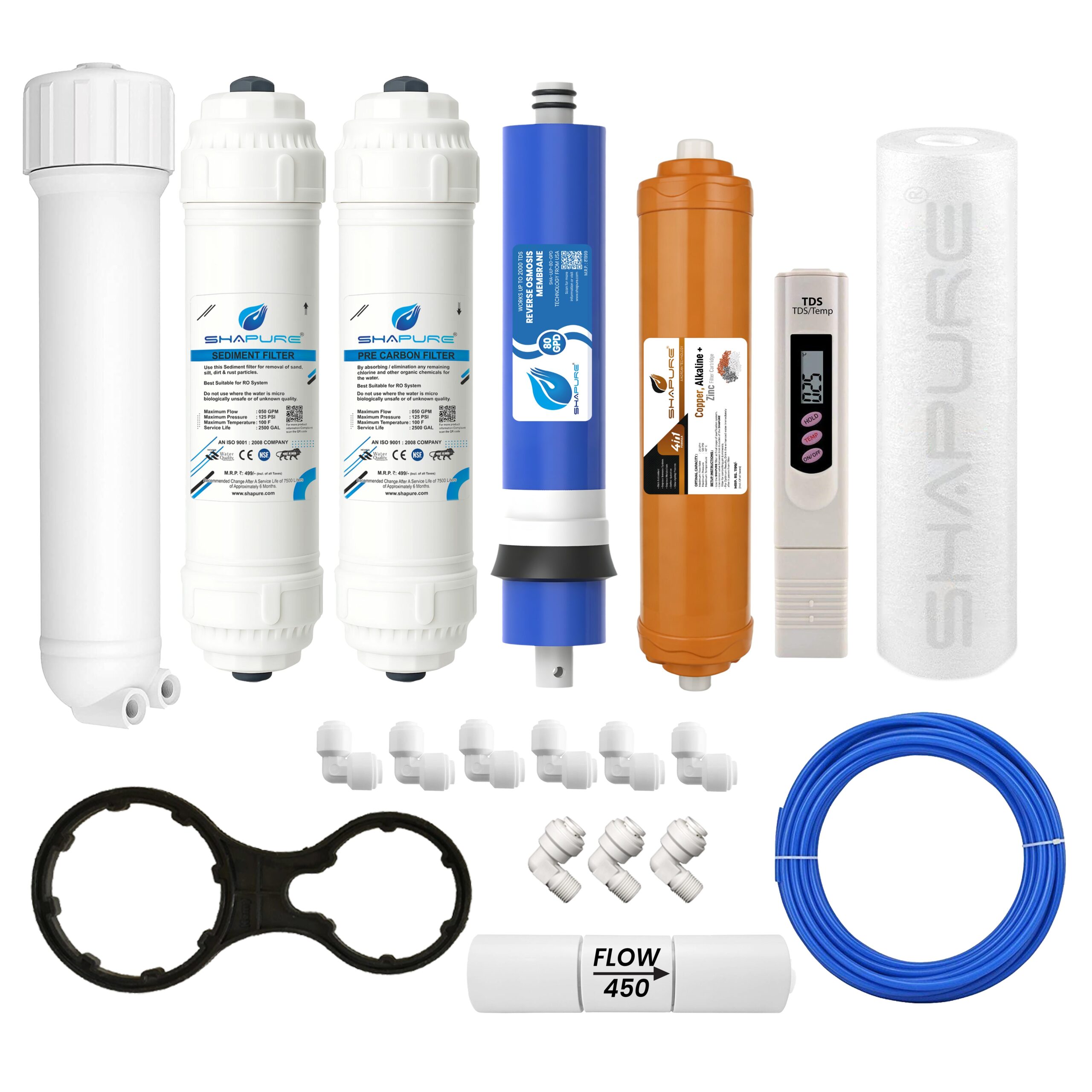 Shapure RO Service Kit for Aqua 2090 | Complete Water Purifier Filter Set with Membrane Housing Carbon Sediment Copper Spun Filters TDS Meter FR-450 Pipes & Connectors